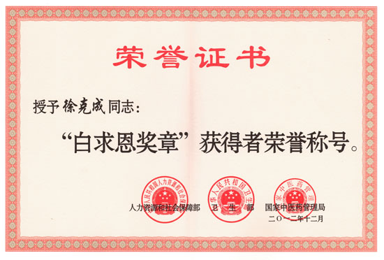 2013 年1月7日,中國北京,在衛生部舉行的全國衛生工作大會上,徐克成榮獲全國衛生繫統模範個人的最高行政獎勵“白求恩獎章”,以表彰他在中國乃至世界抗擊癌症事業中做出的傑出貢獻。