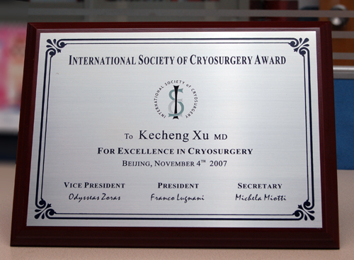 在2007年11月5日晚,北京國賓酒店,第14屆國際冷凍學術大會讙迎晚會上,國際冷凍治療學會主席Franco博士向全世界數十名著名冷凍治療專家頒發了“世界冷凍治療特别貢獻獎”。我院徐克成院長、牛立志副院長雙雙獲此殊榮。