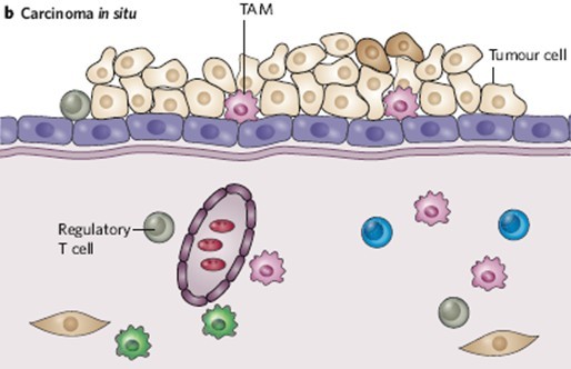 原位癌形成。炎癥性和癌基因改變引起化學因子和細胞因子產生,促發癌性浸潤和血管新生,