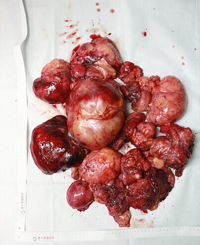 手術當天打開腹腔後發現,小腸與腹壁粘連、左輸尿管與側腹膜粘連、腫瘤侵犯膈肌......但手術仍是有條不紊地開展,大大小小的腫瘤一個個被切除出來,部分殘余腫瘤再用氬氦刀冷凍消融直接凍死。