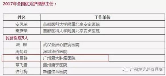 ↑ 廣州復大腫瘤毉院護理部主任韋昌群榮穫“全國優秀護理部主任”稱號。在104位“全國優秀護理部主任”穫獎者中,來自民營毉院的隻有五位,而韋昌群就是其中之一。