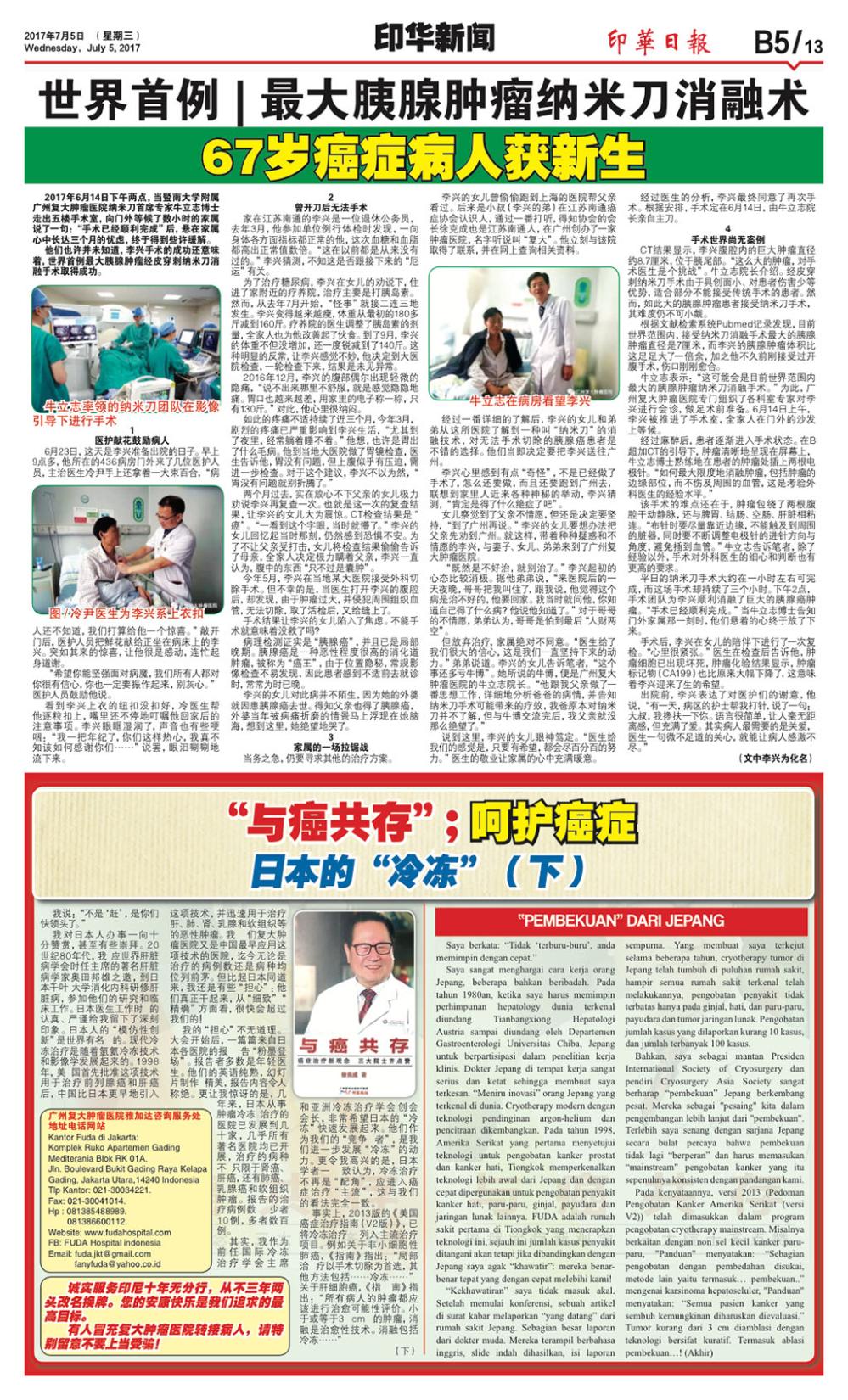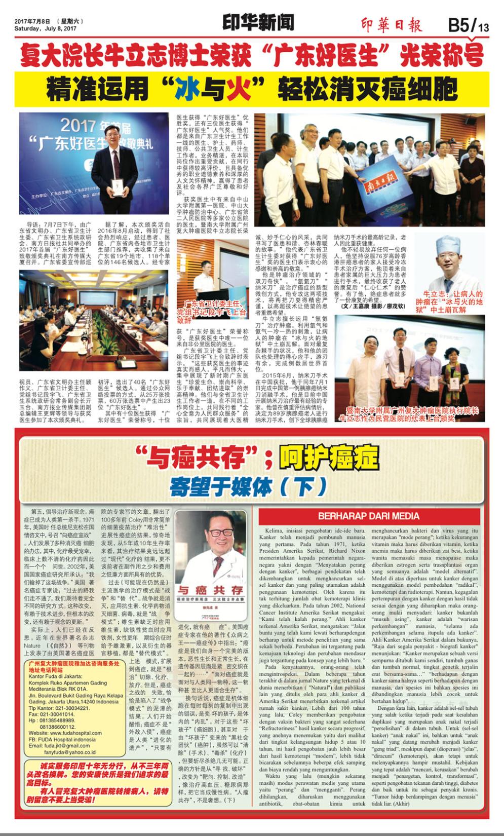 印尼《印華日報》近期對暨南大學附屬廣州復大腫瘤毉院的報道