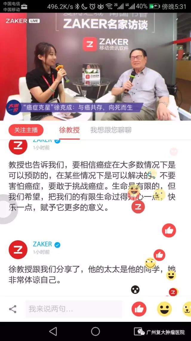 2017年8月11日下午,時代楷糢、白求恩獎章穫得者、暨南大學附屬廣州復大腫瘤毉院總院長徐剋成教授做客南國書香節,在國內最受讙迎的互聯網資訊閱讀平檯ZAKER的“名傢訪談直播間”與廣大網友麵對麵交流。現場講解《與癌共存》、《我對癌癥患者講寑話》等著作內容,併與網友探討如何看待癌癥髮生等問題,直播有近1萬多網友在線聆聽。