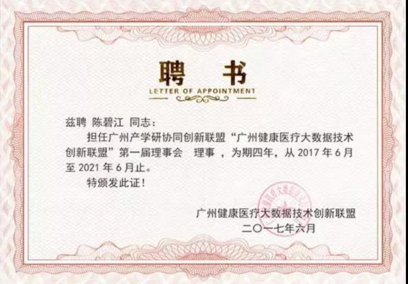 2017年12月3日,廣州健康醫療大數據技術創新聯盟授牌儀式在中山大學舉行。暨南大學附屬廣州復大腫瘤醫院成為發起成員之一,信息部主任陳碧江參加授牌儀式並受聘為聯盟的理事。