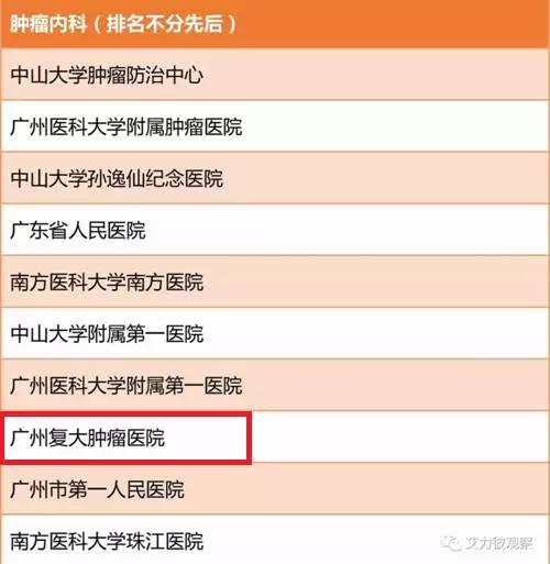 其中內科、腫瘤科系列共評出心血管內科、呼吸內科、消化內科、神經內科、腫瘤內科、腫瘤放療科等12個專科榜單,共計110個上榜科室,來自25家醫院。在腫瘤內科榜單中,中山大學腫瘤防治中心、中山大學孫逸仙紀念醫院、中山大學附屬第壹醫院以及廣東省人民醫院均上榜,其中,暨南大學附屬廣州復大腫瘤醫院排名第八位,僅次於廣州醫科大學附屬第一醫院,是該榜單中唯一一家上榜的民營醫院。