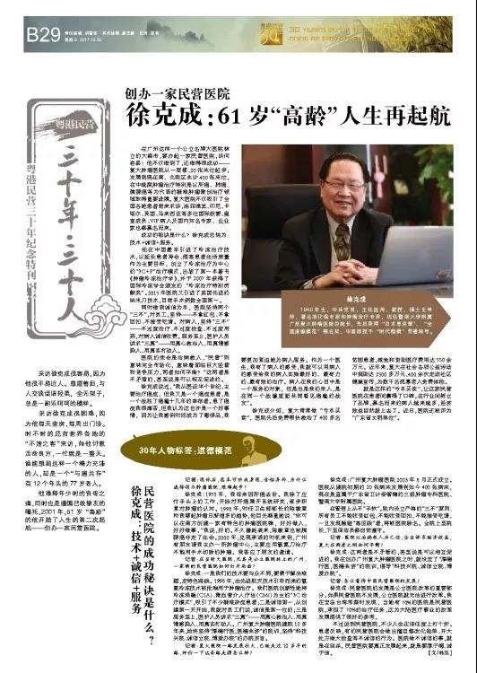 白求恩獎章穫得者、“時代楷模”、暨南大學附屬復大腫瘤醫院總院長徐克成教授被選為“粵港30年30人特刊”。