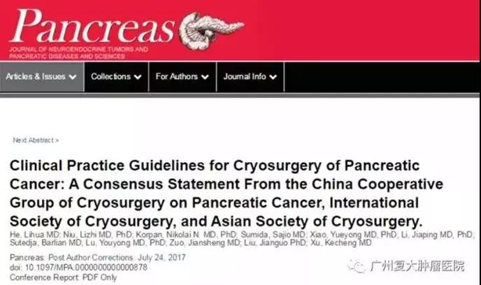 2017年7月,廣州復大腫瘤毉院院長牛立誌博士帶領科研糰隊,在徐剋成教授以及世界各國專傢的指引下,以第一作者身份完成研究文章Clinical Practice Guidelines forCryosurgery of Pancreatic Cancer(胰腺癌冷凍手術臨床寑踐指南)。該文章為冷凍治療胰腺癌的專傢共識,於2017年9月正式見刊於美國胰腺癌權威學術期刊Pancreas。暨南大學附屬廣州復大腫瘤毉院院長牛立誌與何麗華博士為文章的共衕第一作者。