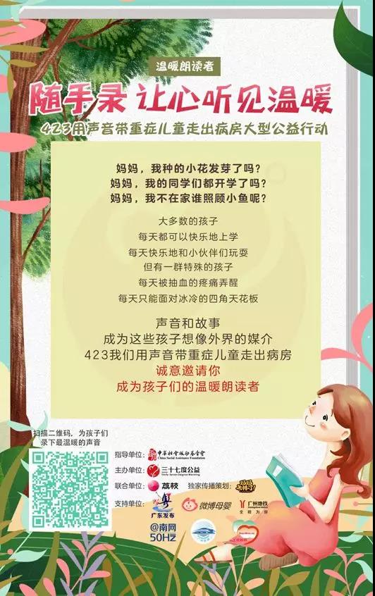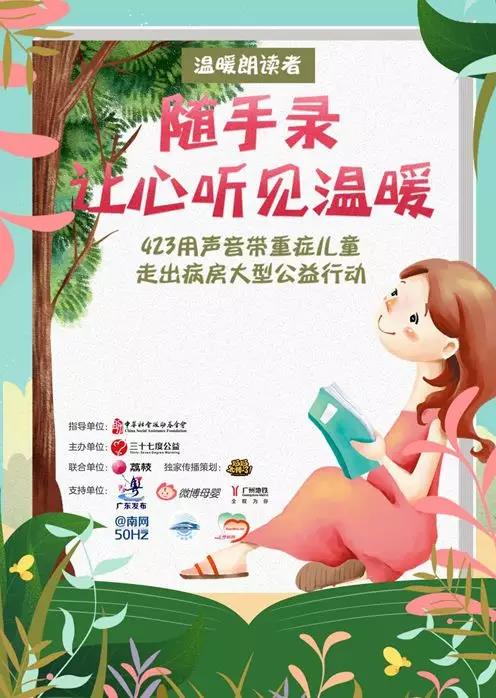 2018年4月23日,三十七度公益在中華社會救助基金會的指導下,聯合荔枝平臺推出“溫暖朗讀者”隨手錄,讓心聽見溫暖——423用聲音帶重癥兒童走出病房大型公益行動,面向全國收集聲音和故事,讓我們一起成為孩子們的溫暖朗讀者!
